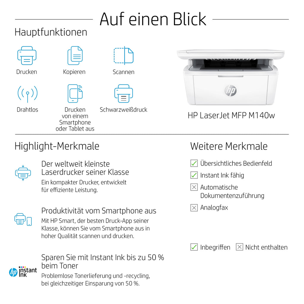 HP LaserJet MFP M140w Drucker, Schwarzweiß, Drucker für Kleine Büros, Drucken, Kopieren, Scannen, Scannen an E-Mail; Scannen an PDF; Kompakte Größe 7MD72F#B19